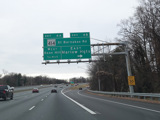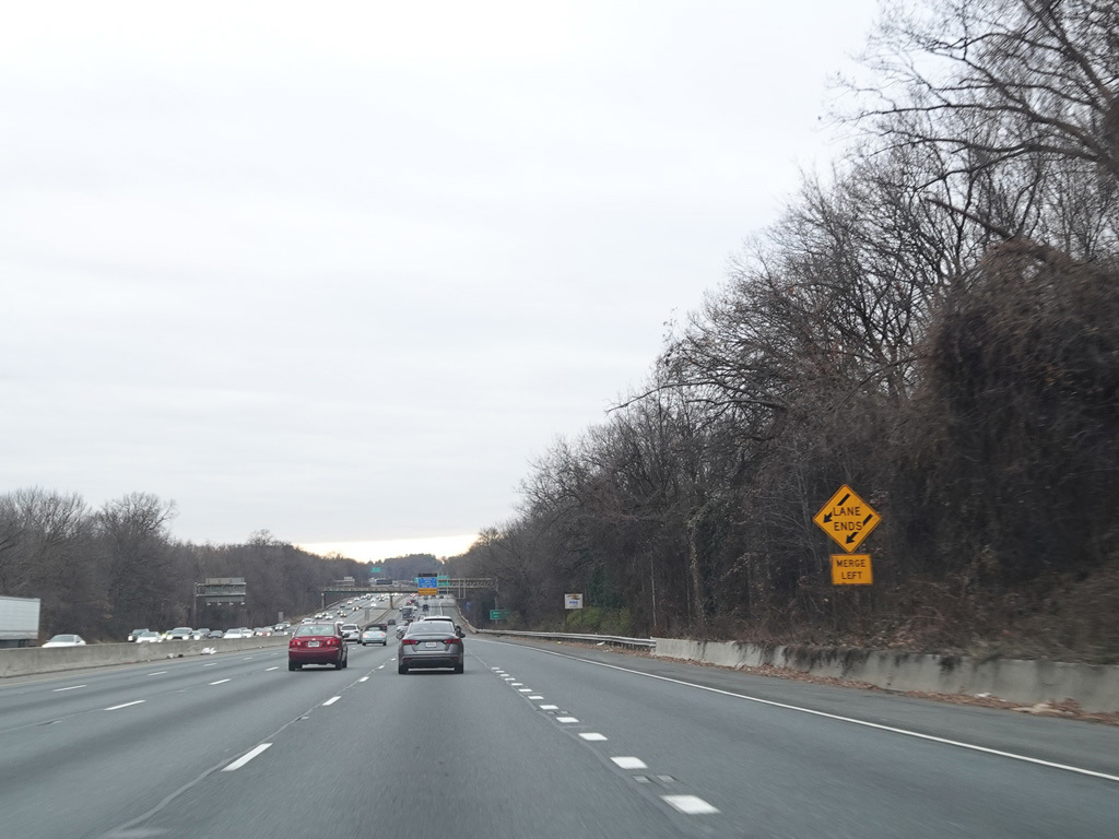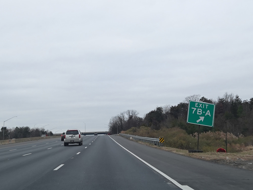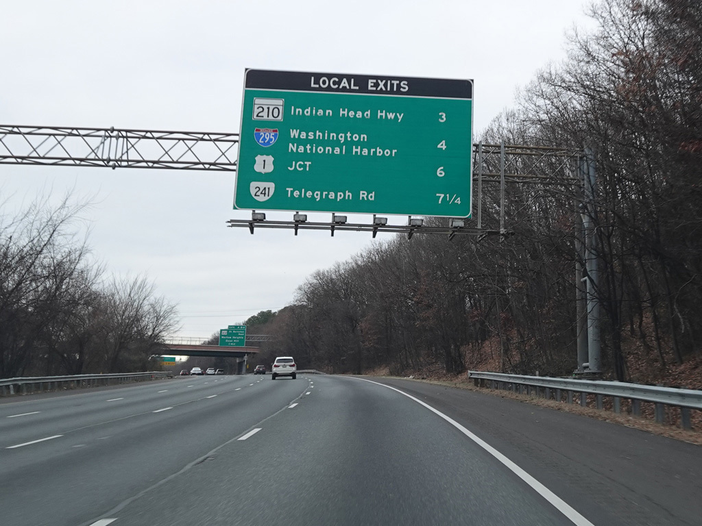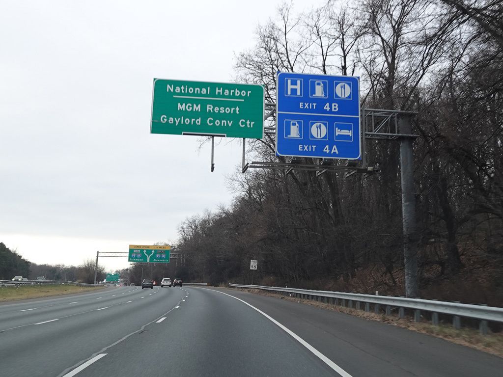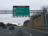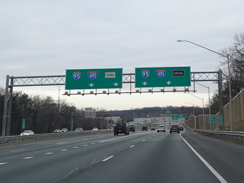 Shortly before crossing into Virginia, the Beltway splits into through and local lanes. There is advance signage for this split before exits 4B-A. The signs indicate which lanes should be used for which exits.