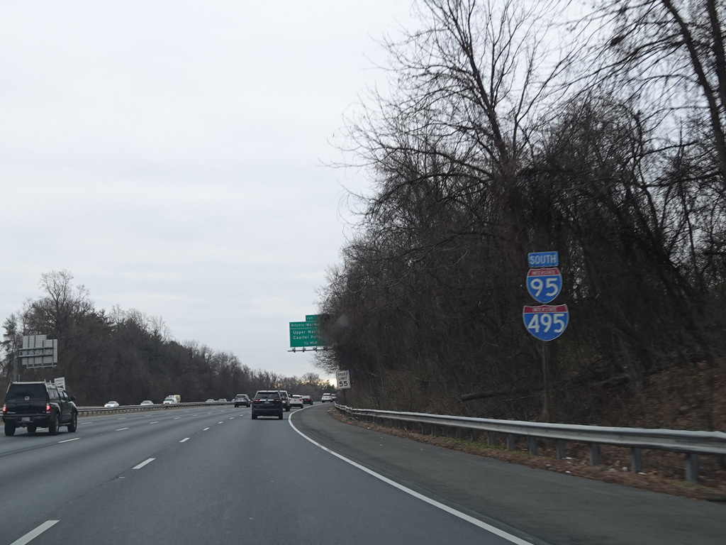 Exit 27 is for the Capital Beltway (I-495) west. Straight ahead, I-95 is multiplexed with I-495 east along the Beltway for the remainder of its length in Maryland. There is a weigh station at exit 27. Trucks must exit here when the weigh station is open. There is access to continue on I-95/I-495 through the exit for trucks using the weigh station.