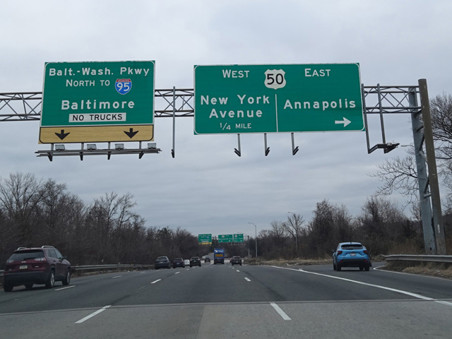 MD 201 is a north/south route in the suburbs of Washington, DC. The Anacostia Freeway (DC 295) becomes MD 201 upon leaving the District of Columbia. It remains a freeway for a short distance into Maryland. Just north of the border, there is an interchange with the John Hanson Highway (US 50). After the interchange, the Baltimore-Washington Parkway (MD 295) begins at MD 201. The freeway then ends, becoming a four-lane divided surface road called Kenilworth Avenue. After crossing the Capital Beltway (I-95/I-495), Kenilworth Avenue becomes Edmonston Road. The MD 201 designation ends after about a mile at Powder Mill Road (MD 212), while Edmonston Road continues north as a local street.