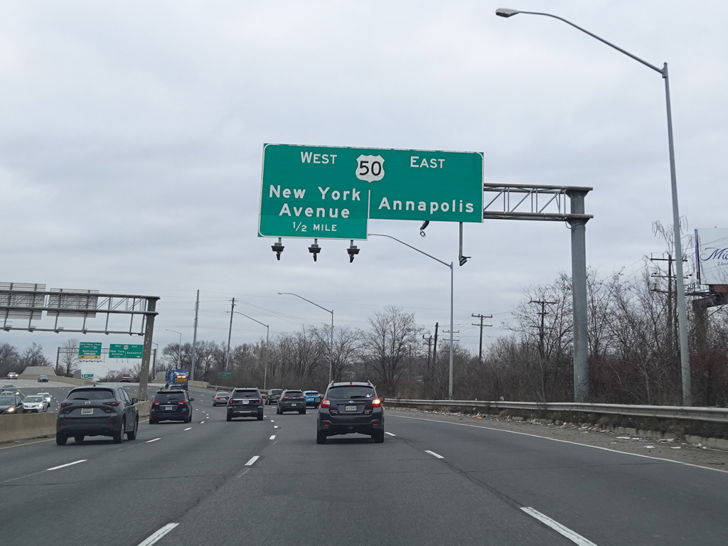 Welcome to Maryland! The Anacostia Freeway (DC 295) becomes Kenilworth Avenue upon entering the state. There is no signage marking the state line. Immediately, the roadway splits. Bear left for the Baltimore-Washington Parkway (MD 295) north, which begins here. The route number is not posted, as this section of the parkway is under the jurisdiction of the National Park Service. Bear right to stay on Kenilworth Avenue. There is a pair of exits on the right for the John Hanson Highway (US 50), which becomes New York Avenue just west of here as it enters the District of Columbia.
