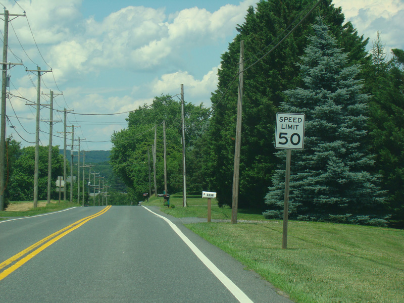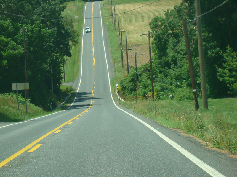 The speed limit drops to 40 MPH. There is an uncontrolled intersection at Old Pylesville Road, and then Ady Road ends at a stop sign at Pylesville Road (MD 165). Turn right to go north or left to go south.