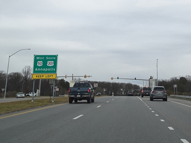 MD 8 is a north/south route on Kent Island. For most of its length, it is a two-lane undivided road called Romancoke Road. It begins at Romancoke Fishing Pier on the east side of the island and runs west for a short distance before curving to the north. After a few miles, it widens to become a four-lane divided highway called Business Parkway. There is an interchange with the US 50/US 301 expressway, and then MD 8 ends at a traffic light at MD 18.