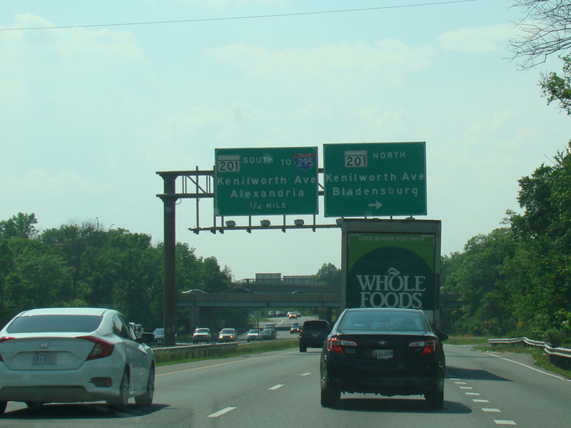 There is a pair of exits for Kenilworth Avenue (MD 201), which becomes the Anacostia Freeway (DC 295) just south of here upon entering the District of Columbia.