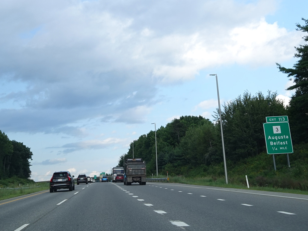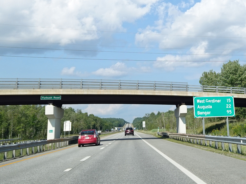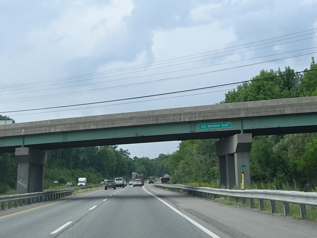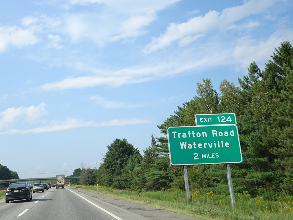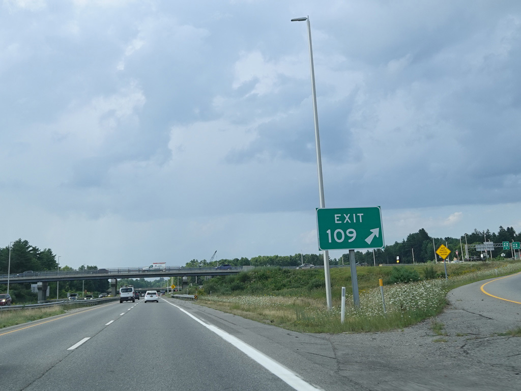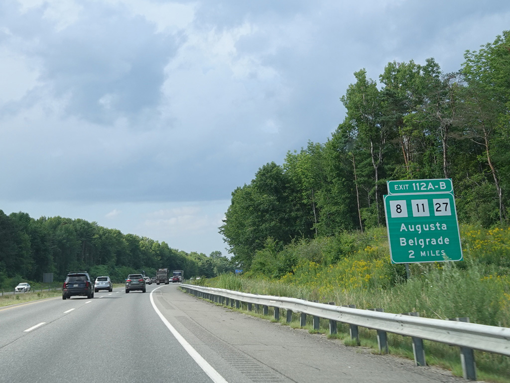 Exit 109 is for Western Avenue (US 202/ME 11/ME 17/ME 100). The Maine Turnpike ends at this point. I-95 continues straight ahead as a free highway from here to the Canadian border.