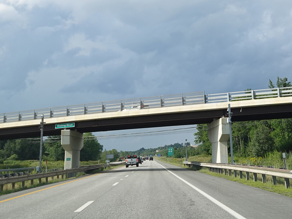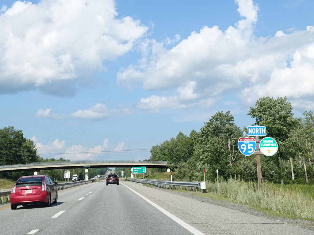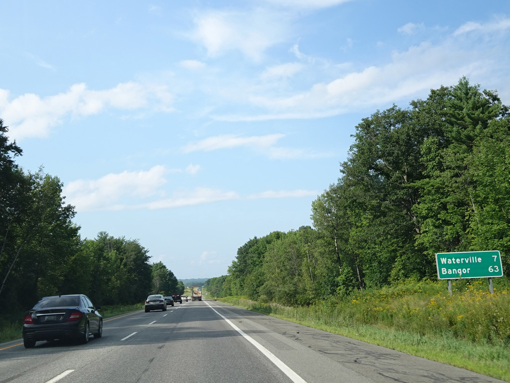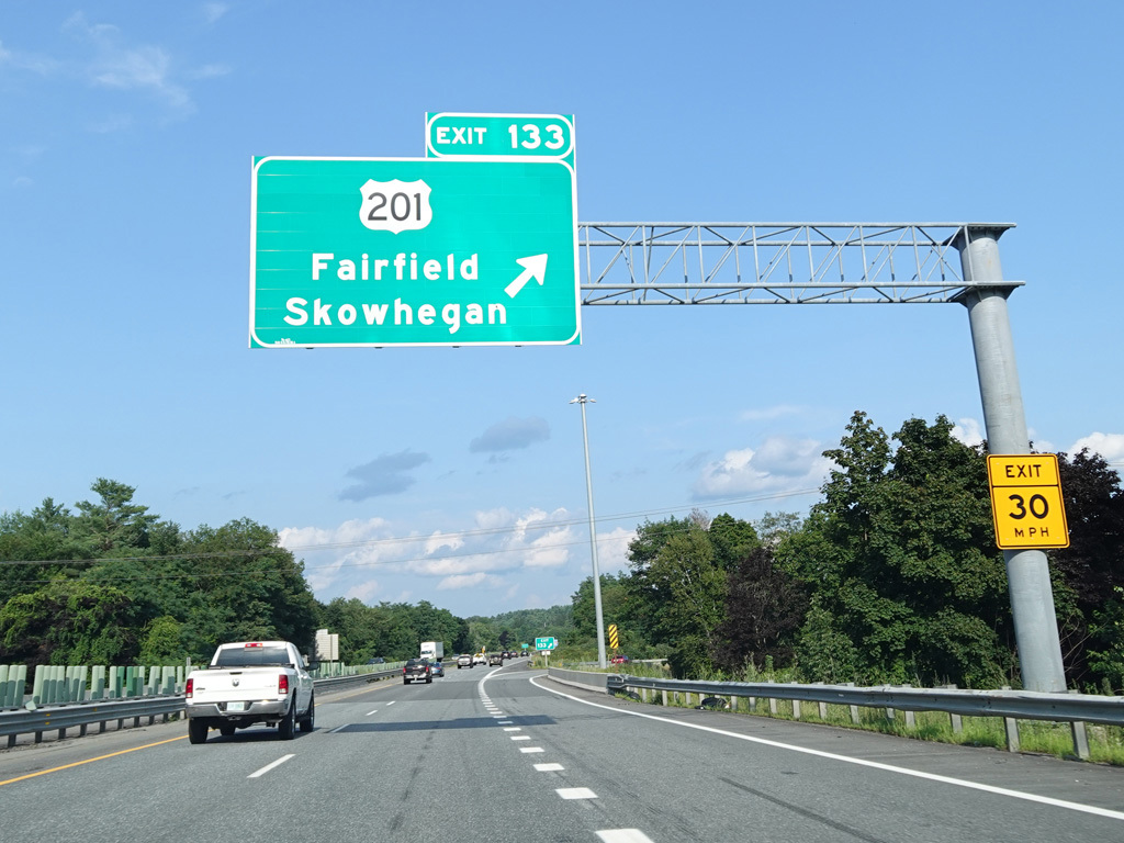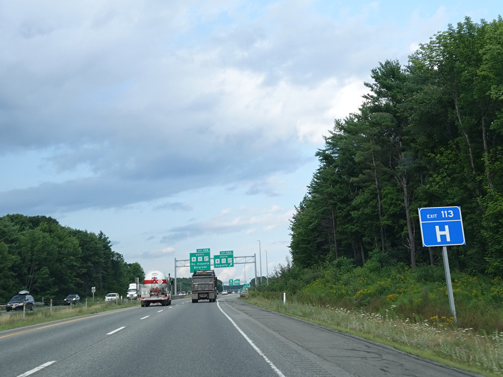 Exit 109 is for Western Avenue (US 202/ME 11/ME 17/ME 100). The Maine Turnpike ends at this point. I-95 continues straight ahead as a free highway from here to the Canadian border.