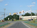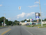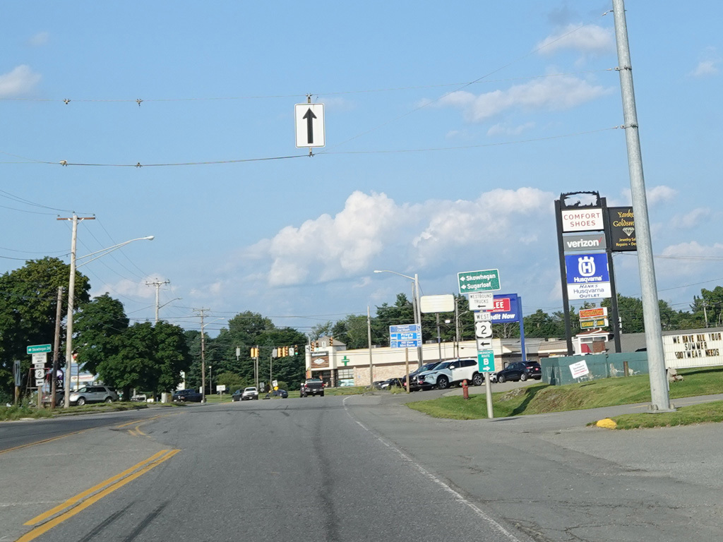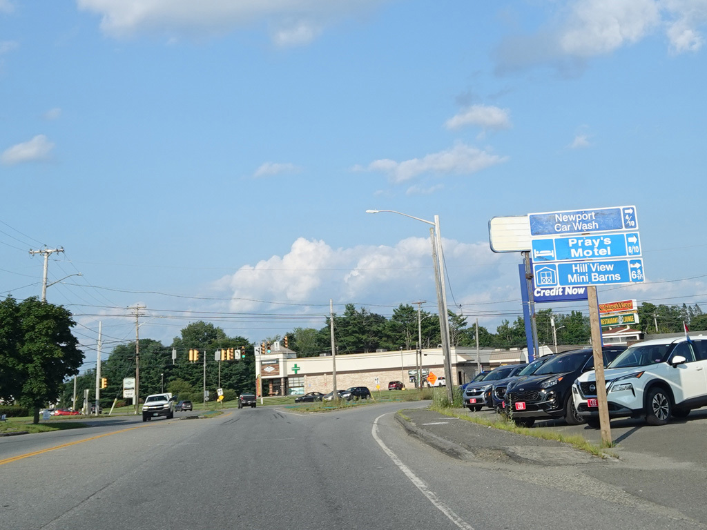There is a traffic light at Main Street (US 2). Turn right to go east or left to go west. Continue straight to stay on ME 11. ME 100 splits off to the right. ME 7 also passes through this intersection. Continue straight ahead to go north, or turn left to go south.