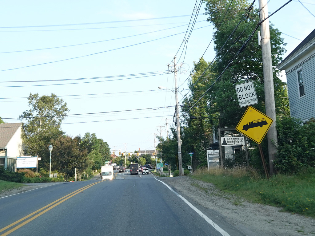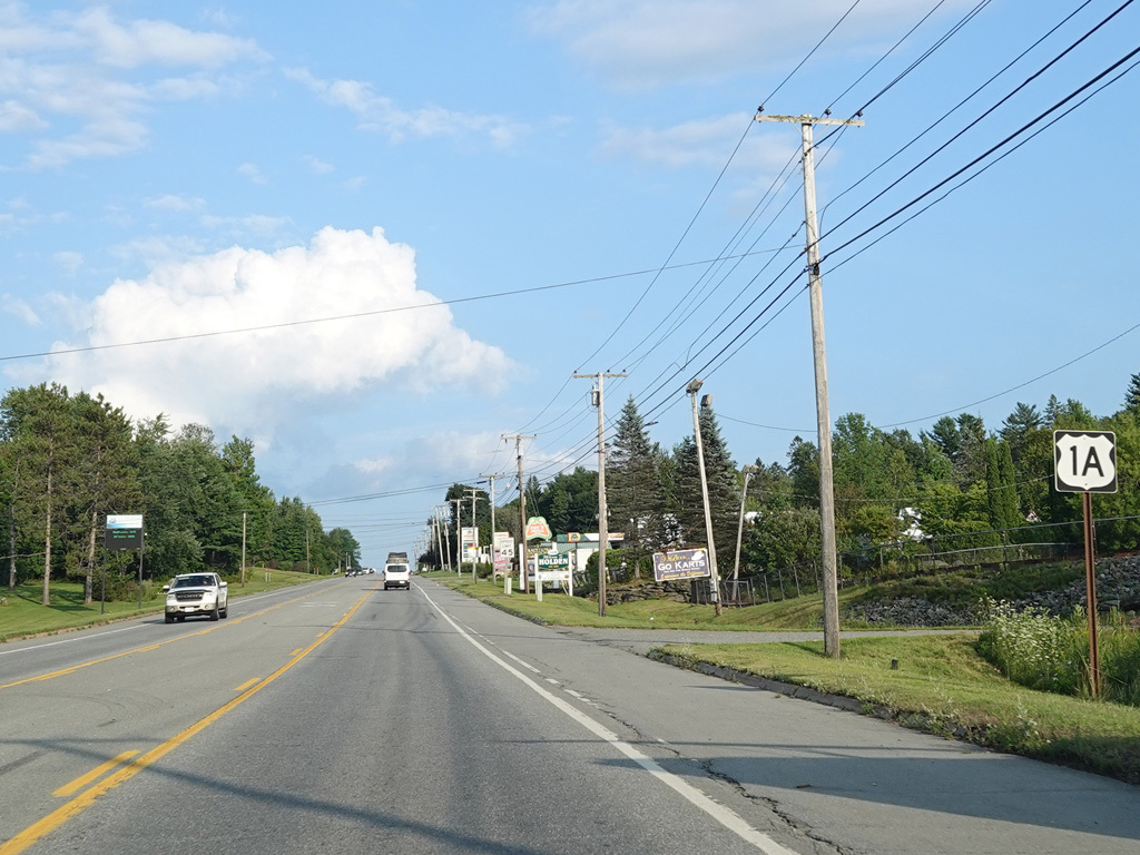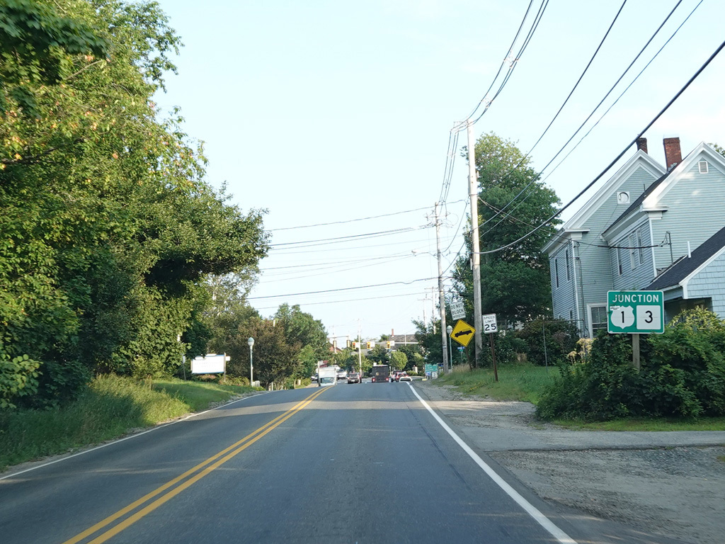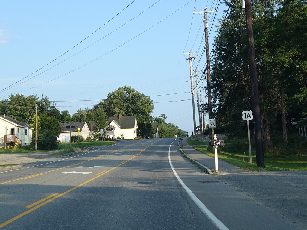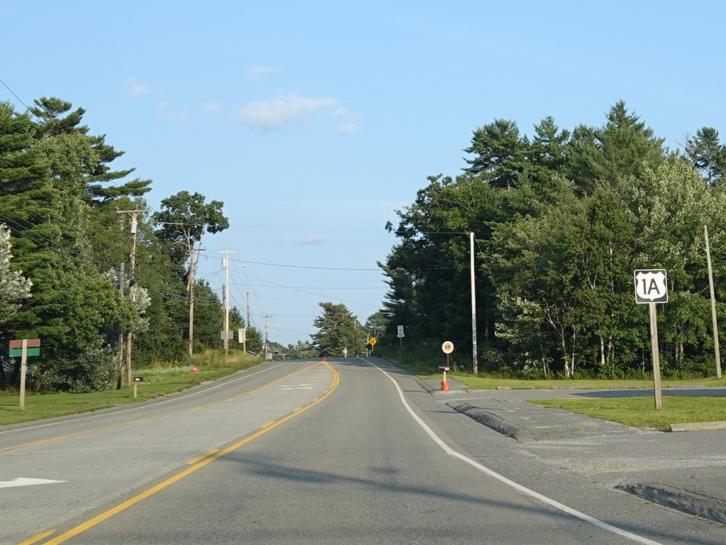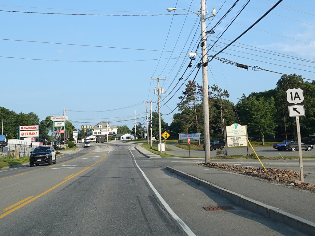 US 1A ends at a traffic light at US 1/ME 3. Continue straight ahead onto High Street to go north. Turn right onto Main Street to go south. Signage at this intersection could use some improvement.