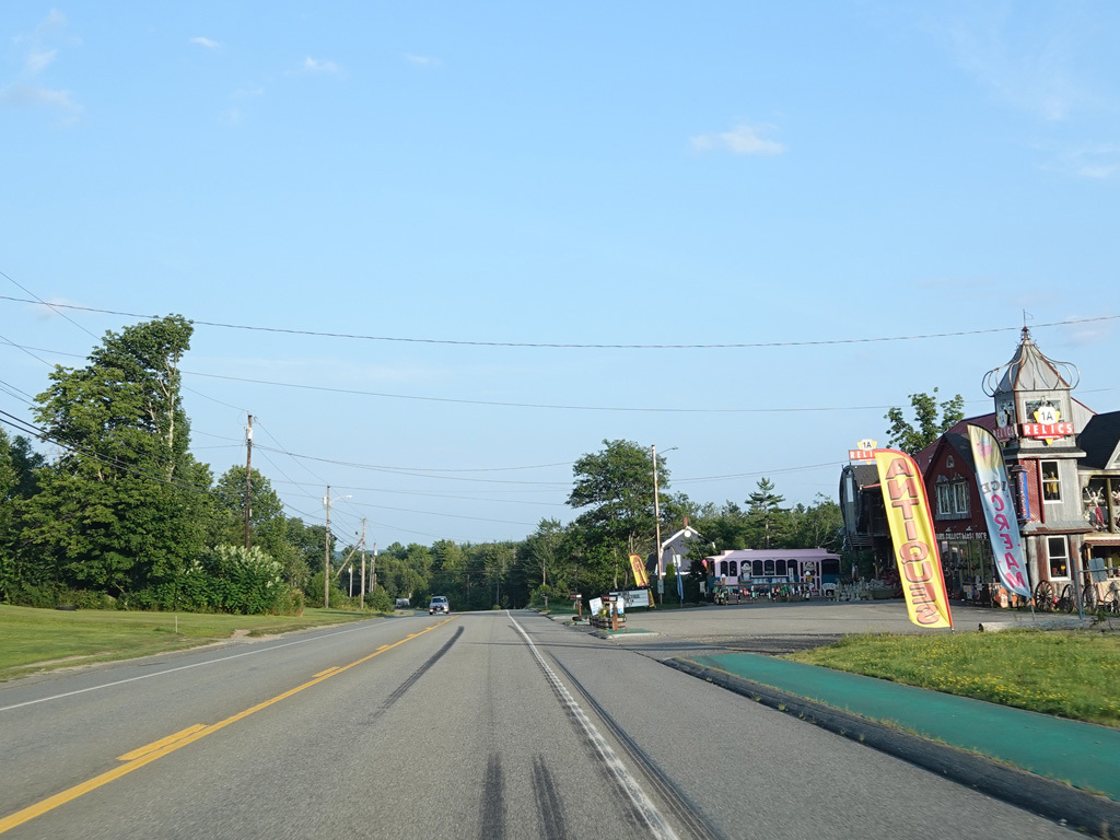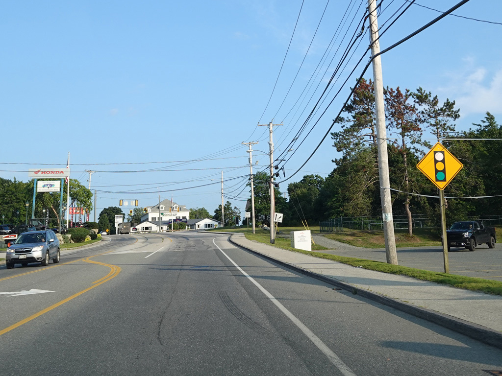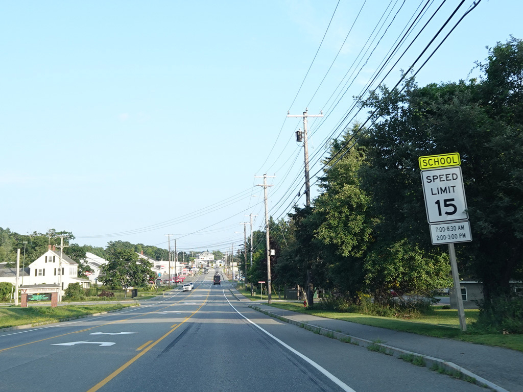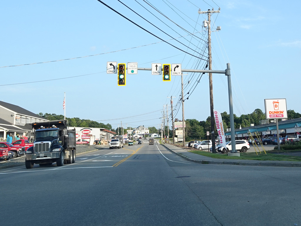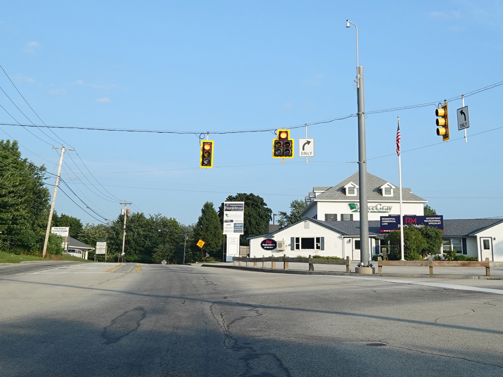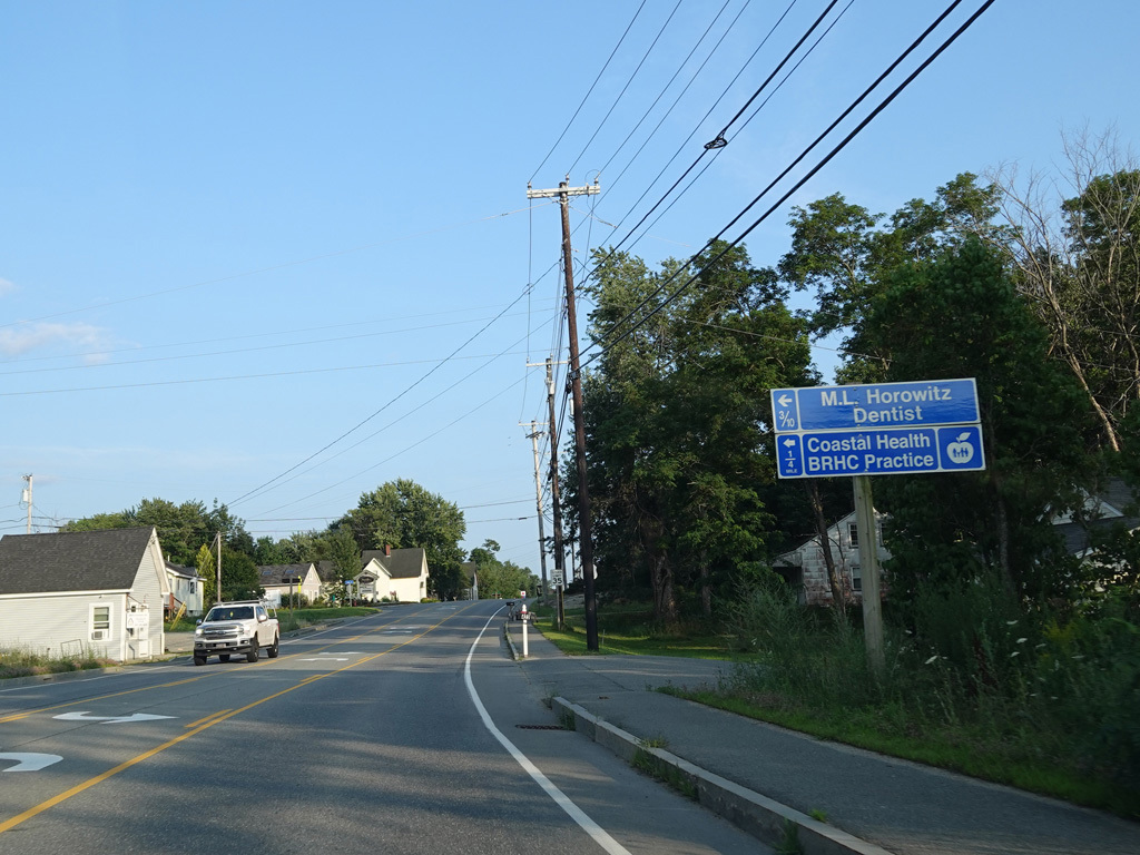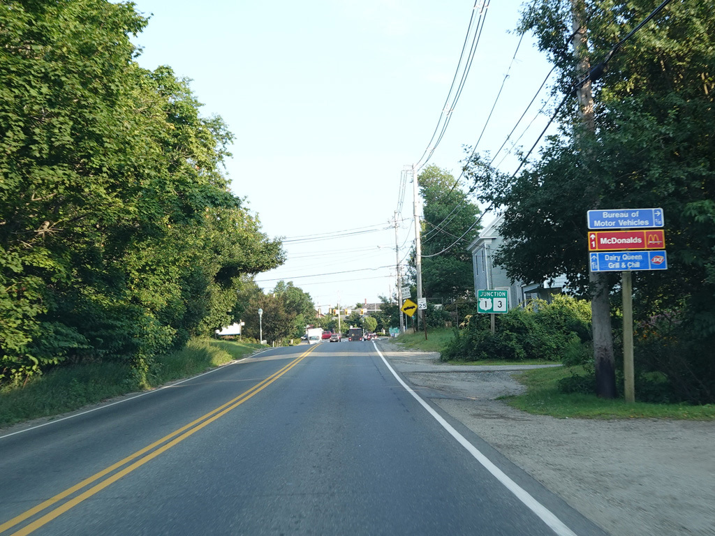 US 1A ends at a traffic light at US 1/ME 3. Continue straight ahead onto High Street to go north. Turn right onto Main Street to go south. Signage at this intersection could use some improvement.