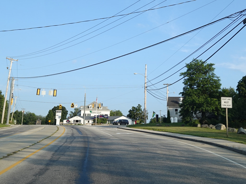 The speed limit drops to 35 MPH. There is a traffic light at ME 46. Turn left onto Kidder Hill Road to go north or right onto Lower Dedham Road to go south.