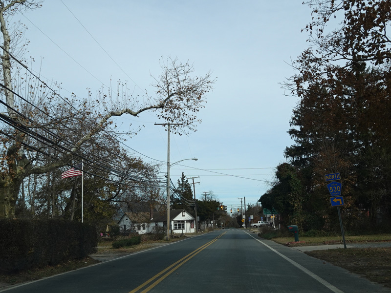 CR 530 ends here at a stop sign. All vehicles must turn left to go north on NJ 166.