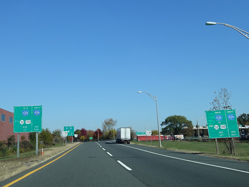 The ramp from exit 8A to Cranbury-South River Road (CR 535) ends at a traffic light. Turn right to north. Turn left to go south toward Forsgate Drive (NJ 32), which in turn leads to US 130.