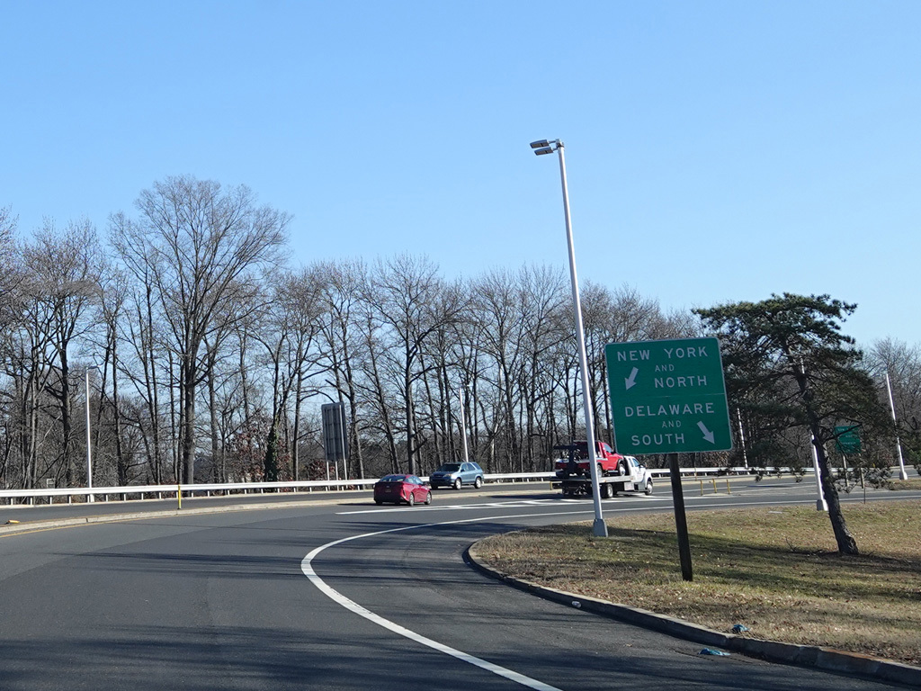 The ramp for exit 3 splits after the toll. Bear right to go north on Black Horse Pike (NJ 168) or left to go south.