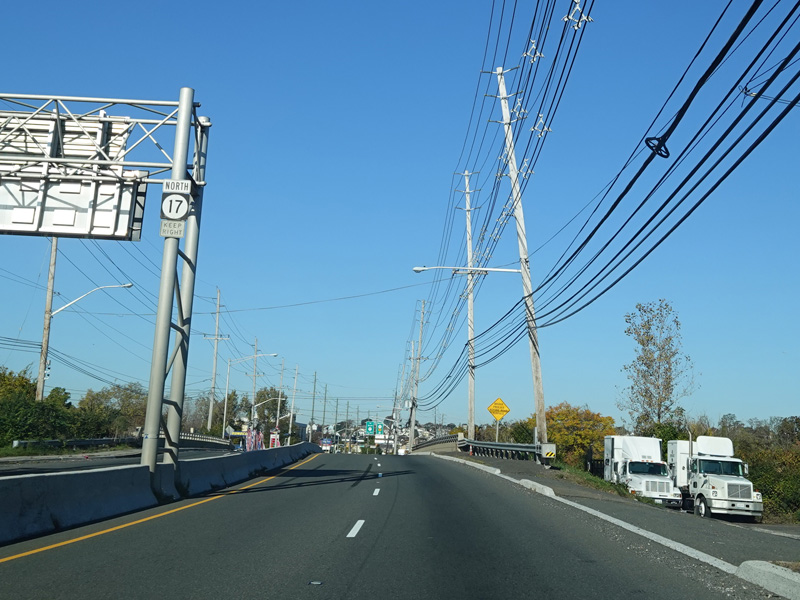 Paterson Plank Road ends at a grade-separated interchange with NJ 17. Take the first right to go north or the second right to go south. Paterson Avenue is straight ahead.