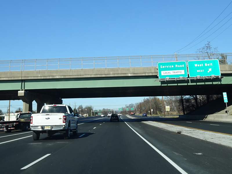 North of the interchange, NJ 23 is a large six-lane divided highway. There is a service road that splits off to the right and has a pair of exits for West Belt.