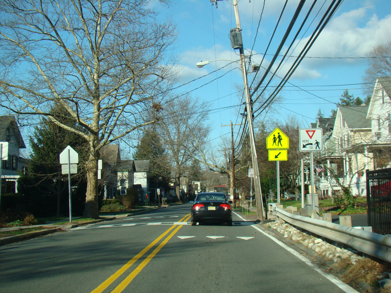 Turn left here for Mount Hope Street. NJ 29 as signed splits off to the left onto Main Street, but Main Street is one-way southbound at this point, so northbound traffic is forced onto NJ 165 straight ahead. The signage here directs northbound traffic to follow NJ 165 for its entire length of about a quarter of a mile and then turn west onto Bridge Street (NJ 179) for one block to rejoin NJ 29 along Main Street.
