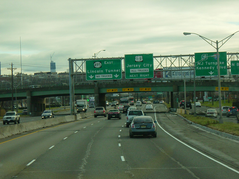 There is an exit for NJ 495 east. NJ 3 ends ahead at Tonnele Avenue (US 1/US 9).
