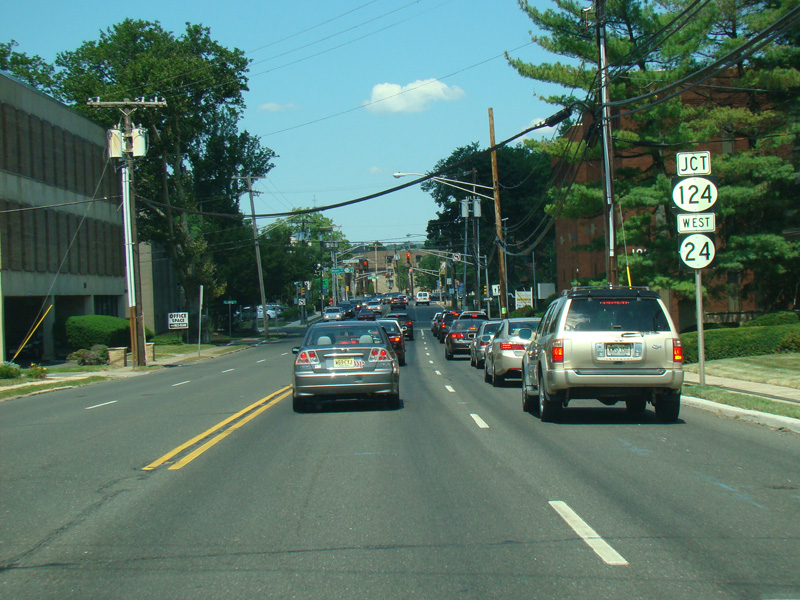 NJ 82 ends here at NJ 124. Take either the first right onto Maple Avenue or the second left onto Meisel Avenue to go east. Continue straight ahead on Morris Avenue to go west. CR 577 is multiplexed with NJ 124 at this intersection. Take the first right to go north or the second left to go south.