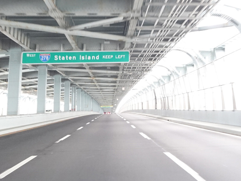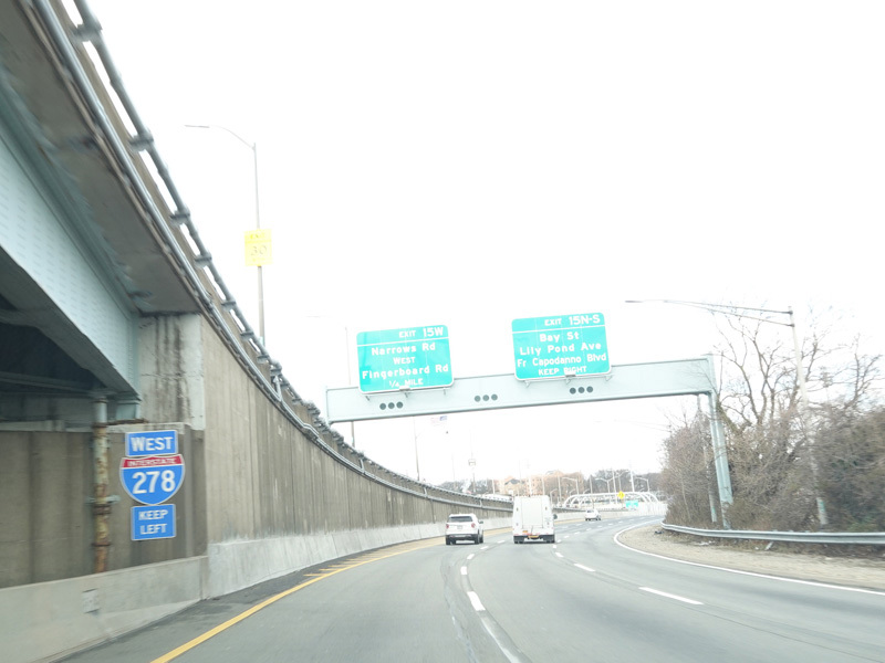 On the other side of the bridge, there is a cashless tolling gantry. There are two exits on the right. Exit 15N is for Bay Street. Exits 15S is for Lily Pond Avenue south and Father Capodanno Boulevard. Continue straight ahead for exit 15W for Narrows Road west and Fingerboard Road. Use the entrance ramp on the left to get on the Staten Island Expressway.