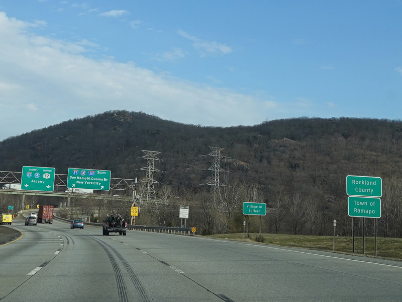 Welcome to New York, Rockland County, the Town of Ramapo, and the Village of Suffern! I-287 enters the state multiplexed with NJ 17, which becomes NY 17 at the state line. The roadway splits. Bear right to stay on I-287, which is multiplexed with I-87 along the New York Thruway south. Bear right for to stay for the Thruway north and NY 17 north.