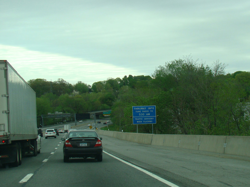 On the other side of the bridge, the two routes split. The New York Thruway (I-87) curves south toward New York City, while I-287 continues east as the Cross Westchester Expressway. Exit 3 is for the Sprain Parkway south.