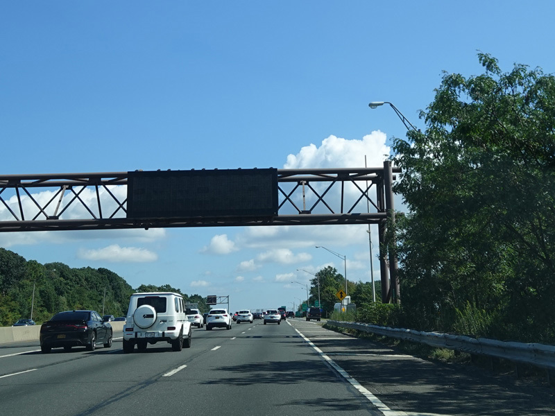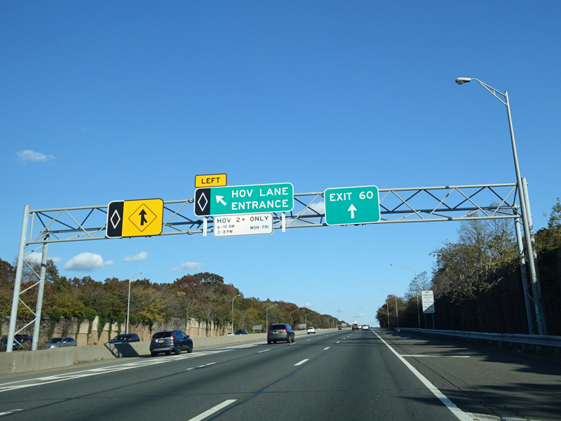 Exit 64 is for NY 112. The HOV lane ends here and the expressway has three lanes in each direction from here until its eastern terminus.