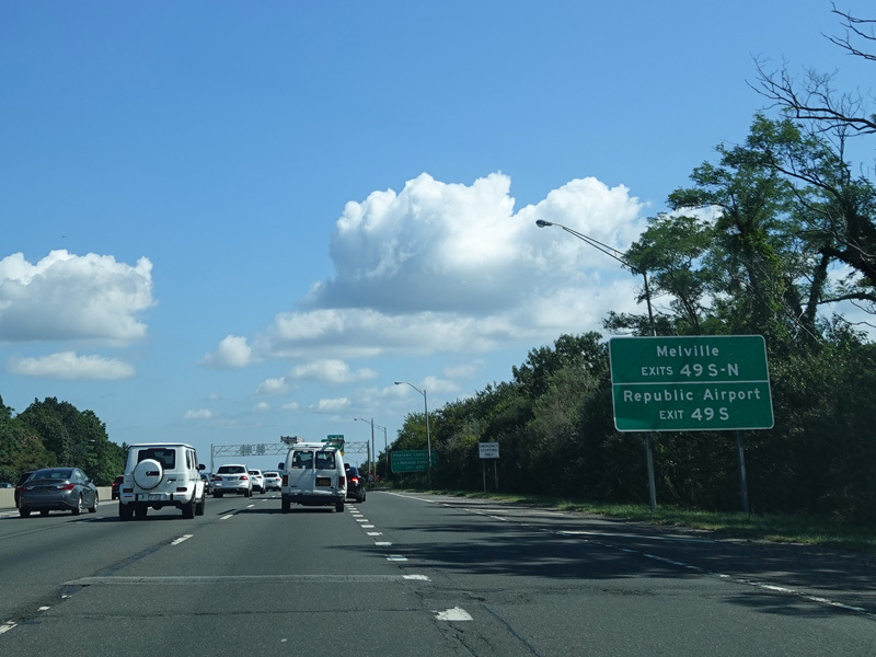 Welcome to Suffolk County! Exits 49S-N are for Broad Hollow Road (NY 110). Exit 49S also provides access to Pinelawn Road (CR 3).