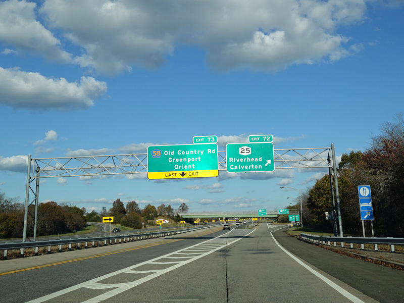 Exit 72 is for NY 25. Exit 73 is for Old Country Road (CR 58), which bypasses Riverhead and is the most direct route to the North Fork.