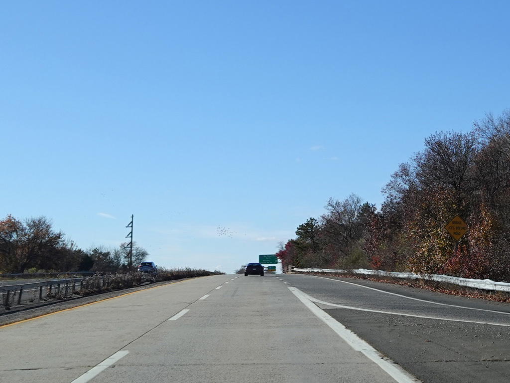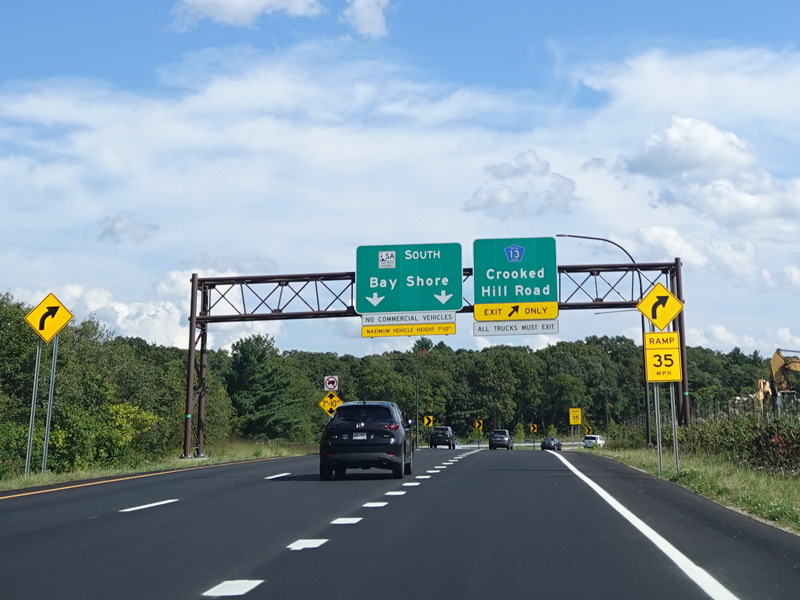 The ramp from the eastbound service road to the Sagtikos Parkway south splits twice. Bear right at either split for Crooked Hill Road (CR 13). The ramp from the westbound service road merges from the left between the two splits.