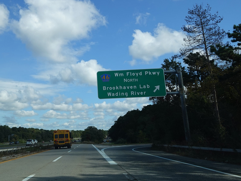 The ramp for exit 68 was constructed to be part of an unbuilt extension of the service road. There is a pair of exits for the William Floyd Parkway (CR 46), followed by an entrance back onto the expressway. The ramp ends ahead at an industrial park.
