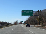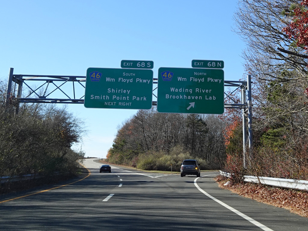 The ramp for exit 68 when travelling west was also constructed to be part of an unbuilt extension of the service road. There is a pair of exits for the William Floyd Parkway (CR 46), followed by an entrances back onto the expressway. The signage on the ramp in this direction makes reference to exits 68N-S, even though the signage on the expressway itself treats this as a single exit 68. Continue straight ahead for access to The Shoppes Boulevard.