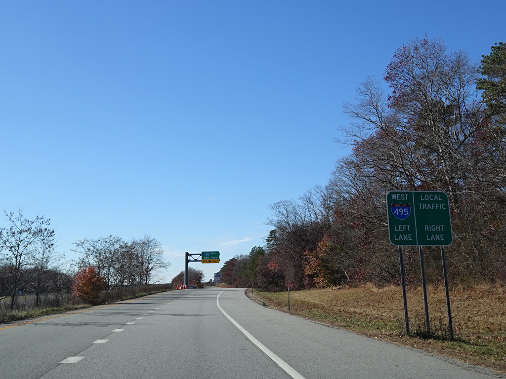 The ramp for exit 68 when travelling east was constructed to be part of an unbuilt extension of the service road. There is a pair of exits for the William Floyd Parkway (CR 46), followed by an entrance back onto the expressway. The ramp ends ahead at an industrial park.