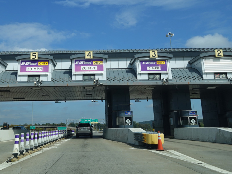 The ramp onto the Thruway from US 9W in Nyack splits. Bear right to go north or left to go south. Motorists getting onto the Tappan Zee Bridge pass under a temporary gantry for cashless tolling. The toll will ultimately be moved back to the other side of the river once the bridge reconstruction is complete.