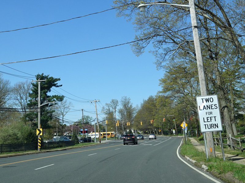 Searingtown Road ends here at a traffic light at CR 8. Turn left onto Herricks Road to go south. Continue straight ahead onto Shelter Rock Road to go north.