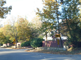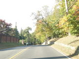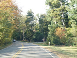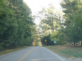 The northbound and southbound lanes split to form a circle. There is a pond in the middle of the circle.