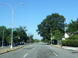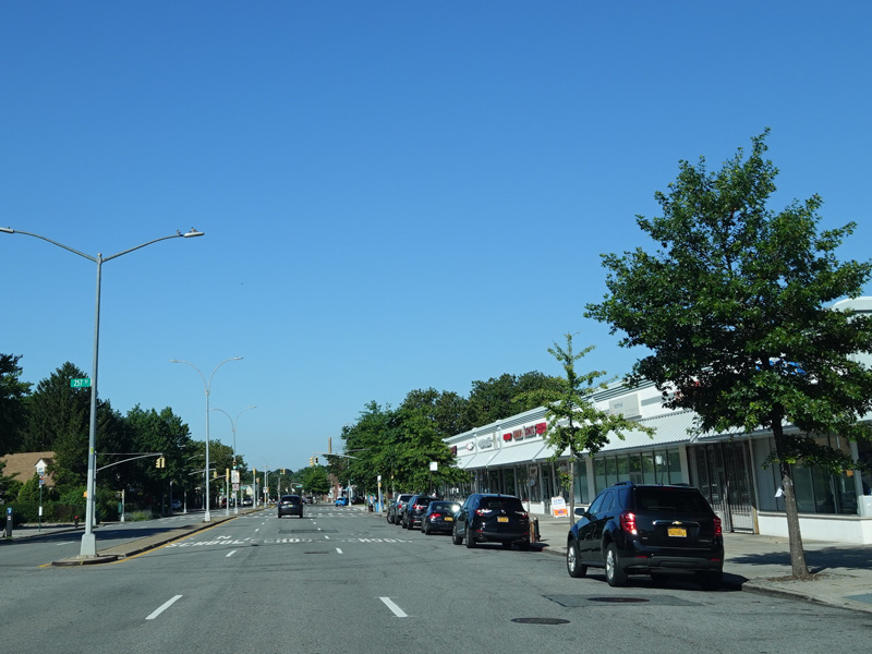 Welcome to Queens! Union Turnpike loses the NY 25C designation at the county line and runs west as a four-lane divided road. There is an oversized street name sign at Little Neck Parkway.