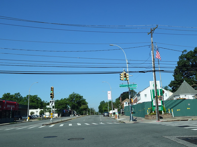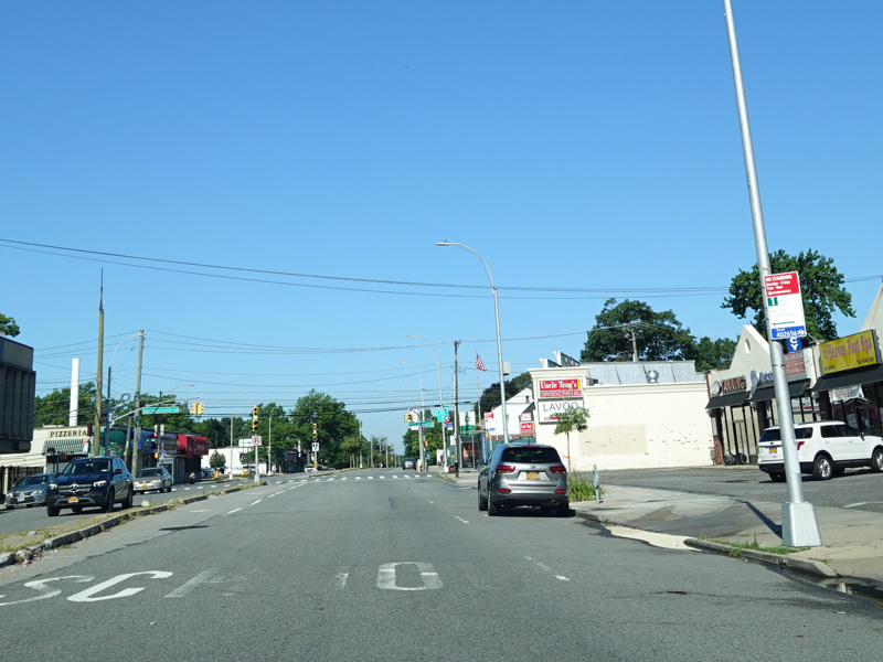 Union Turnpike continues west through Queens. There are oversized street name signs at Springfield Boulevard, Bell Boulevard, and Hollis Hills Terrace.