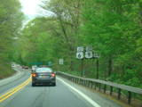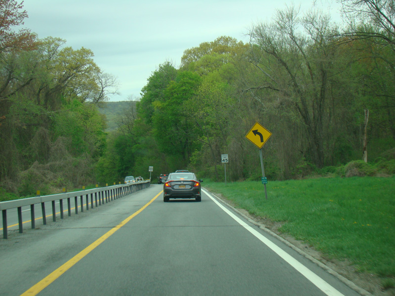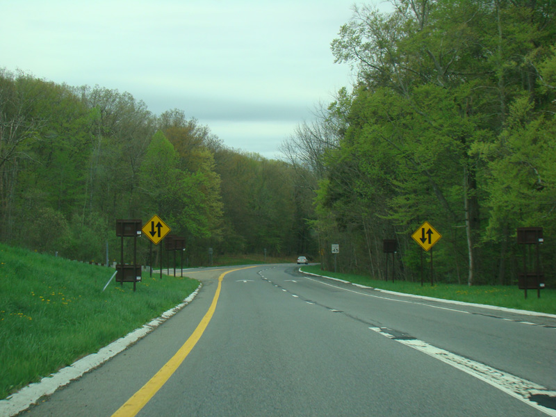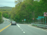 The Bear Mountain Parkway begins at the Taconic Parkway. The ramps merge together and narrow down to form a two-lane undivided road.