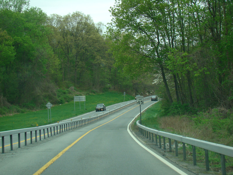 After about a mile, the parkway begins again and continues west as a two-lane undivided road.
