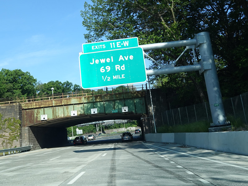 Exit 9P is for Flushing Meadows Corona Park. Exit 9E is for Northern Boulevard (NY 25A) east, the Whitestone Expressway (I-678) north, and the Van Wyck Expressway (I-678) south. Exit 9W is for Northern Boulevard (NY 25A) west.