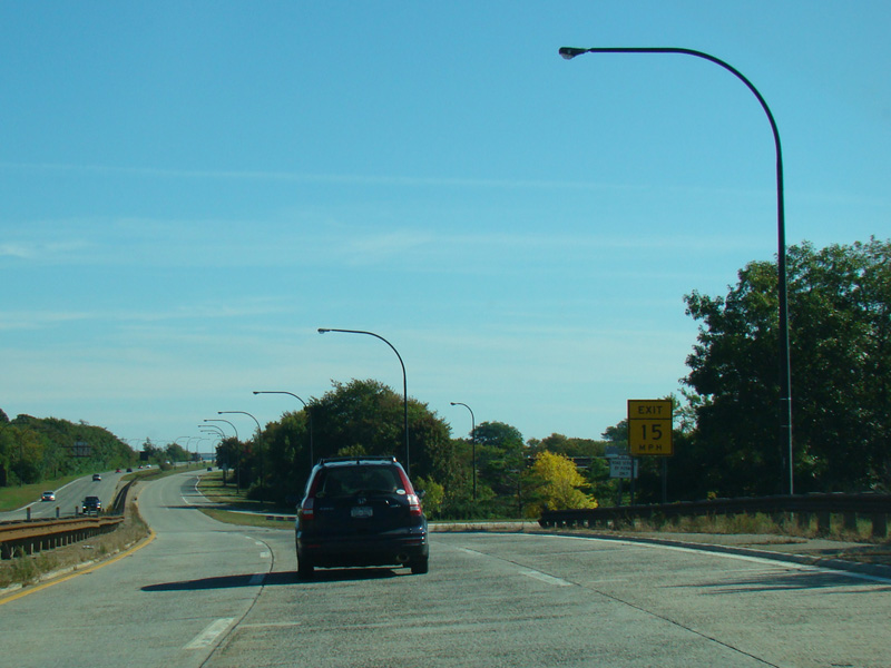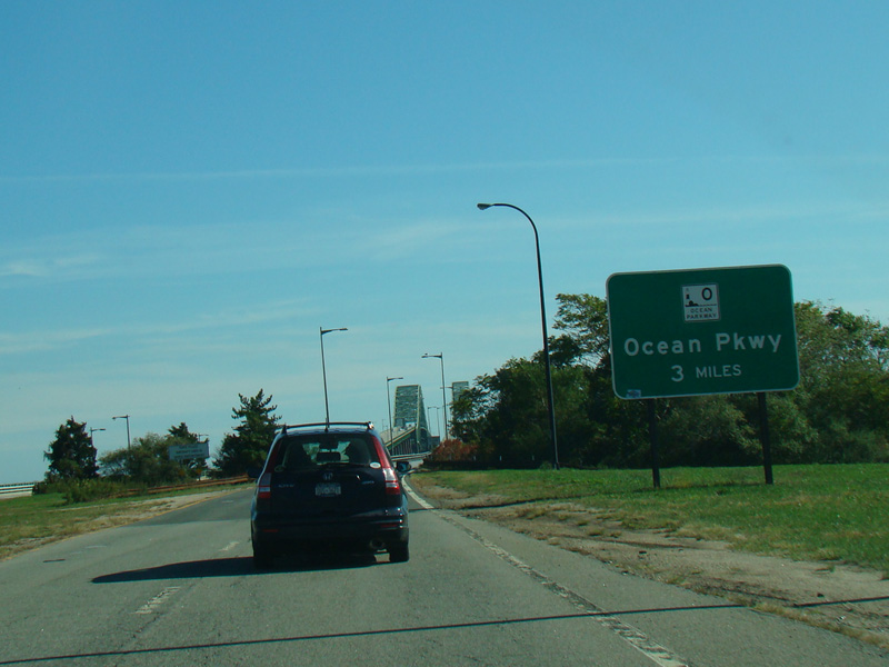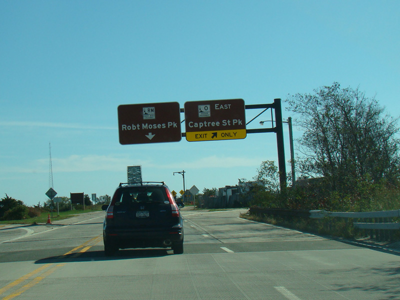 The Robert Moses Causeway begins at the Southern Parkway. Exits RM1W-E are for Sunrise Highway (NY 27).