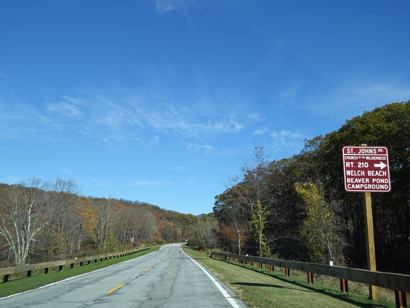 St. Johns Road begins on the right here and extends to Kanawauke Road (CR 106), which the sign references as "Route 210." The NY 210 designation along present-day CR 106 was decommissioned in 1972.