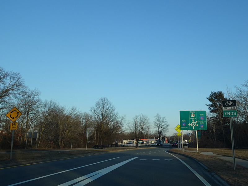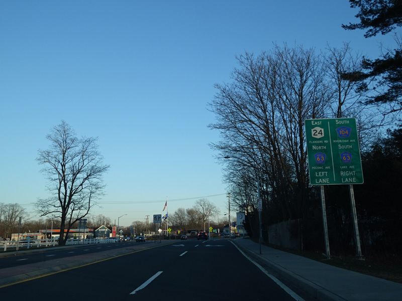 Center Drive ends at a traffic circle at Lake Avenue (CR 63), Riverleigh Avenue (CR 104), and Peconic Avenue (CR 63). CR 94 ends here, and NY 24 continues straight ahead onto Flanders Road.