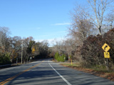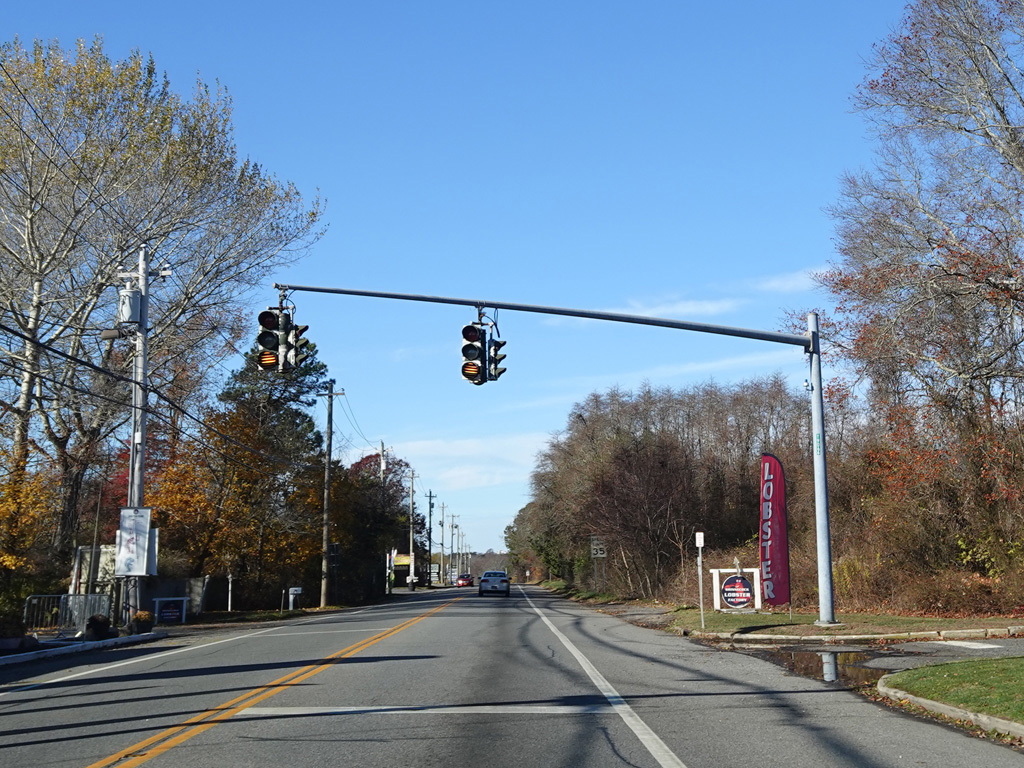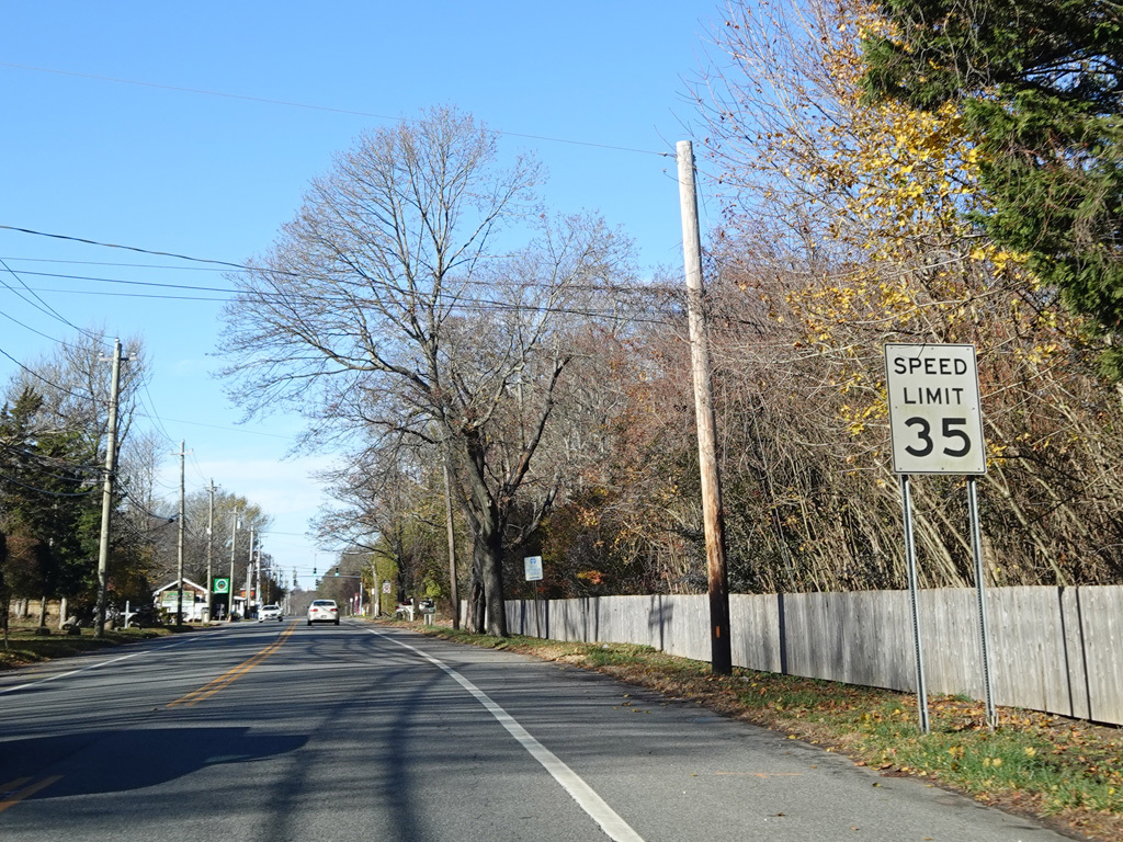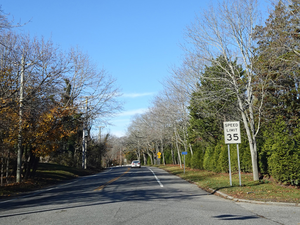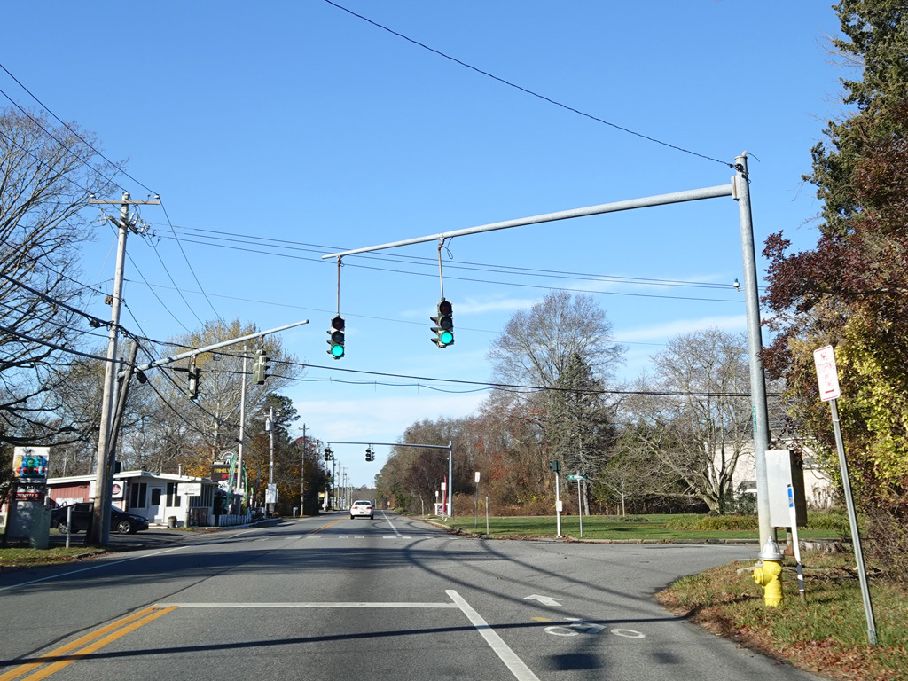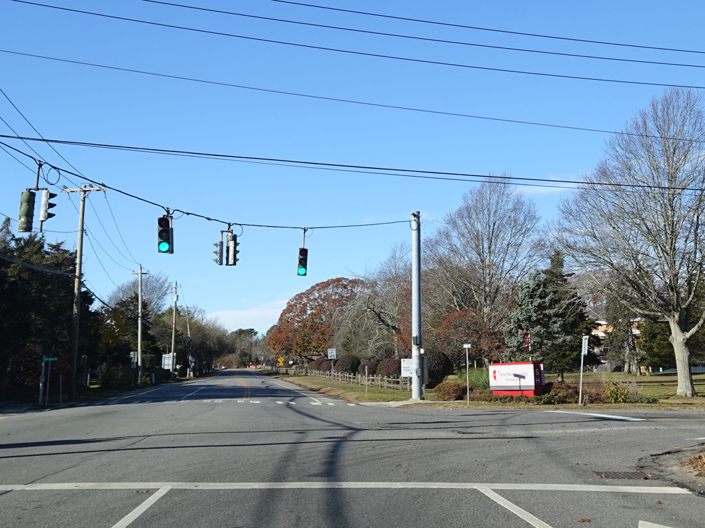 Hill Street becomes Montauk Highway at a flasher at Tuckahoe Lane in Southampton. Here, Montauk Highway is an unsigned state route with NY 27A reference markers.