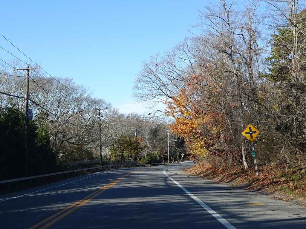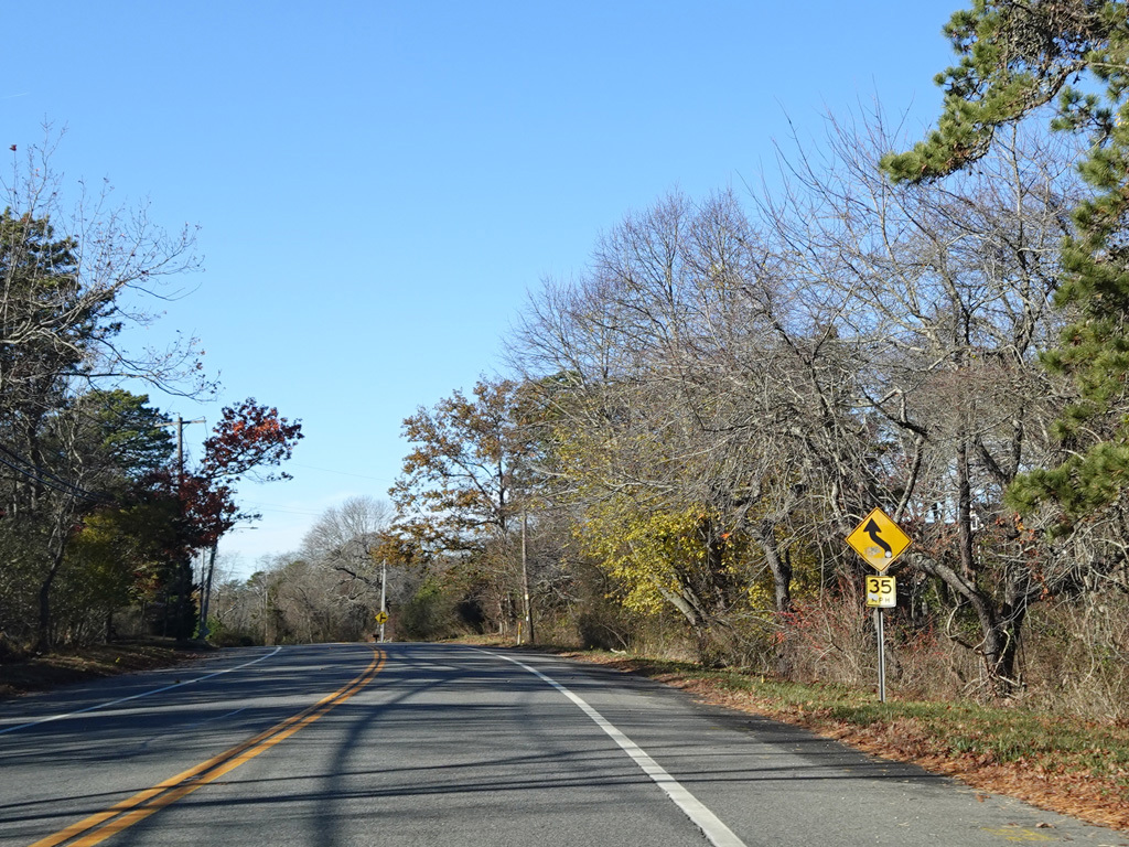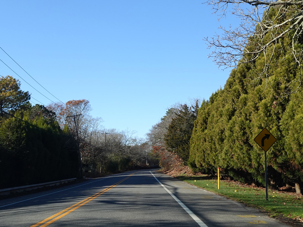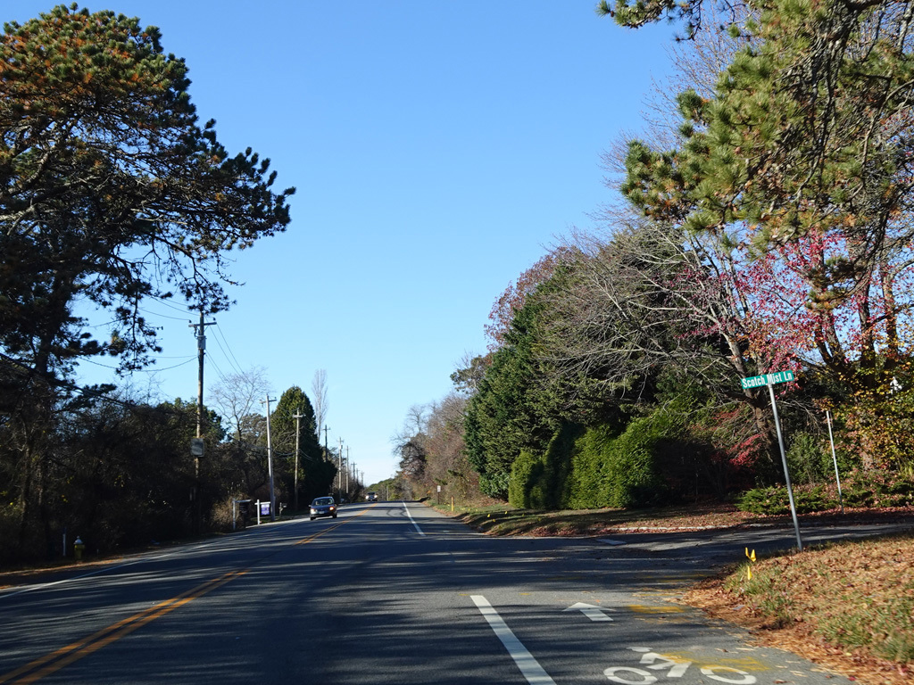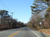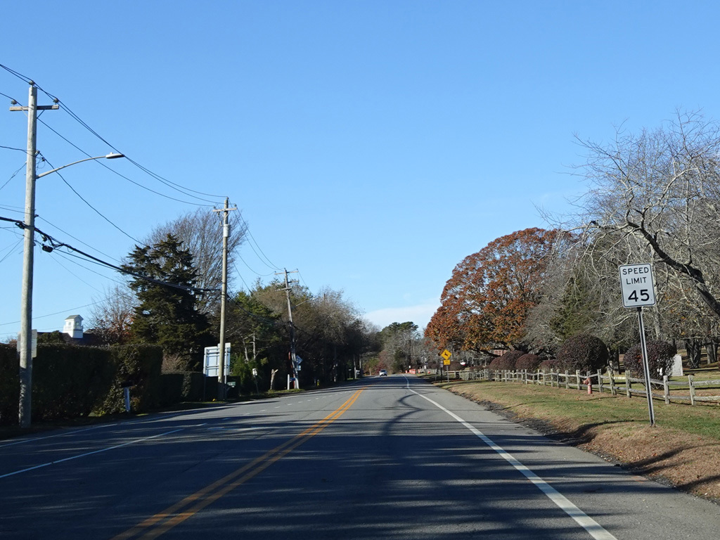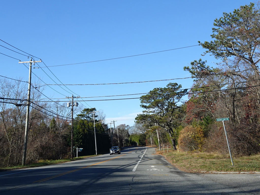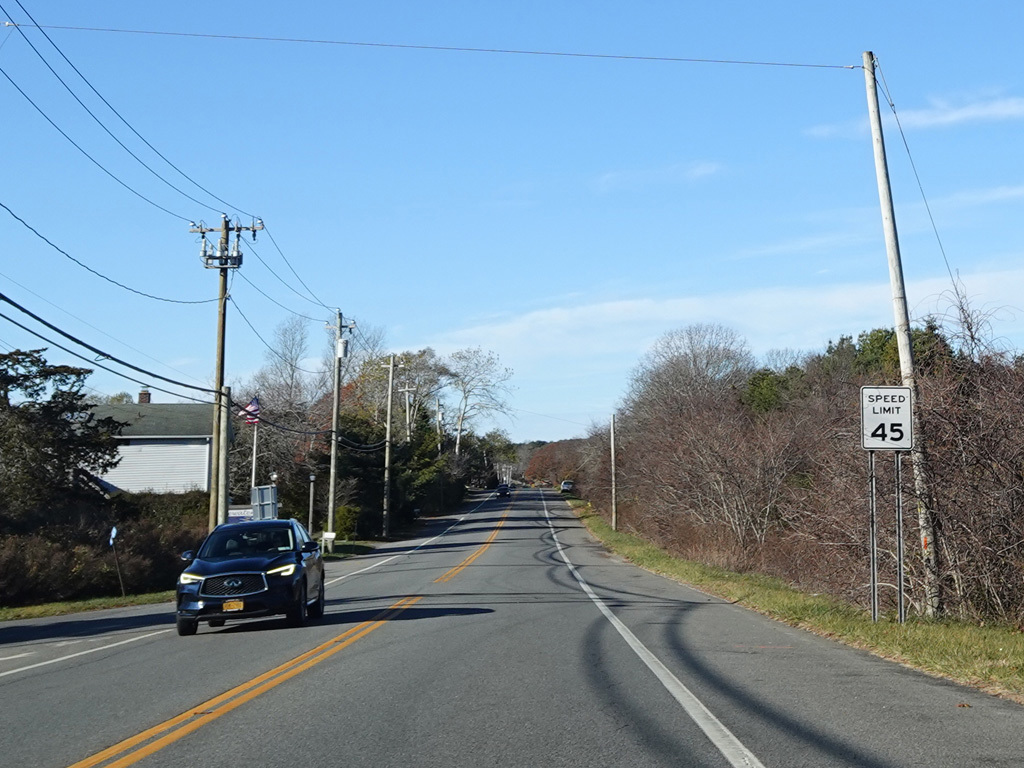 Montauk Highway runs west as a two-lane undivided road. The Shinnecock Nation is on the left here.