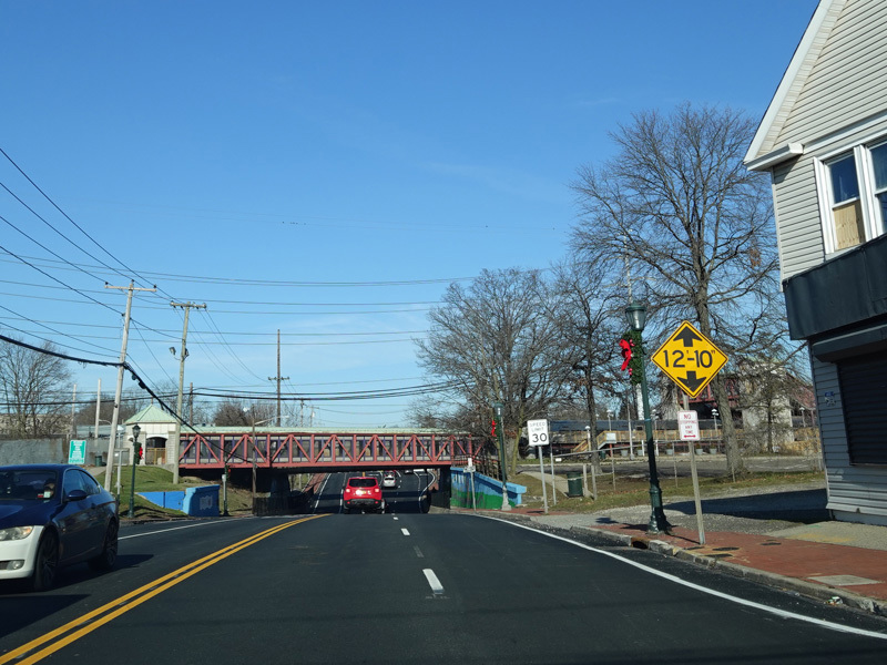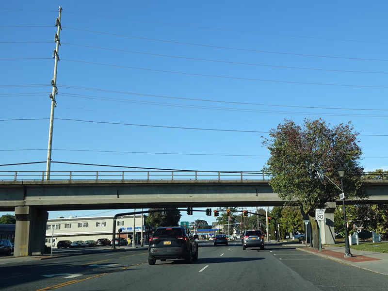 Broadway widens to four lanes and passes under the Babylon Branch of the Long Island Rail Road.