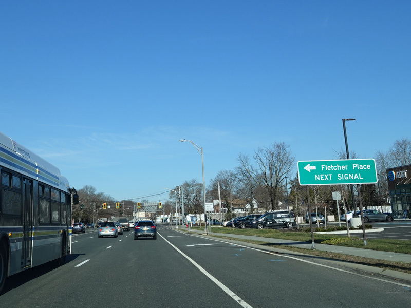 There is a traffic light at Fletcher Place. Then, Walt Whitman Road narrows down to four lanes. The Walt Whitman Mall is on the right.