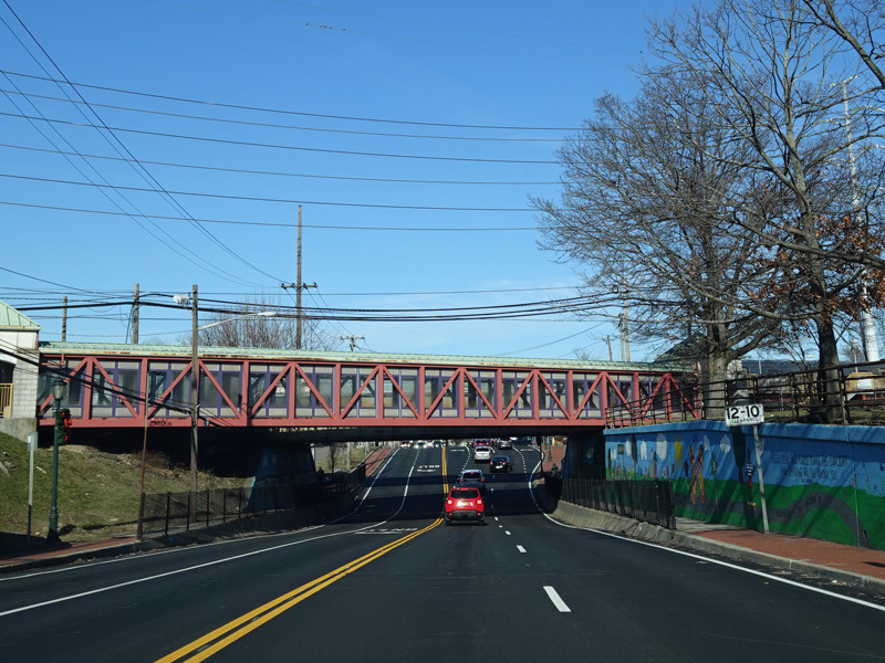 New York Avenue widens to four lanes and passes under the Huntington Branch of the Long Island Rail Road.