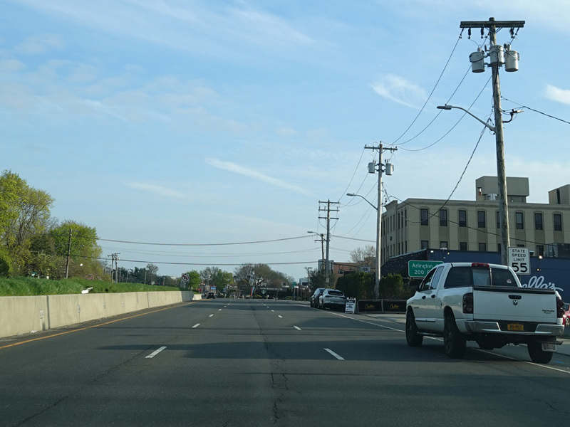 Broad Hollow Road runs south as a six-lane divided highway. There is an uncontrolled intersection at Arlington Street.