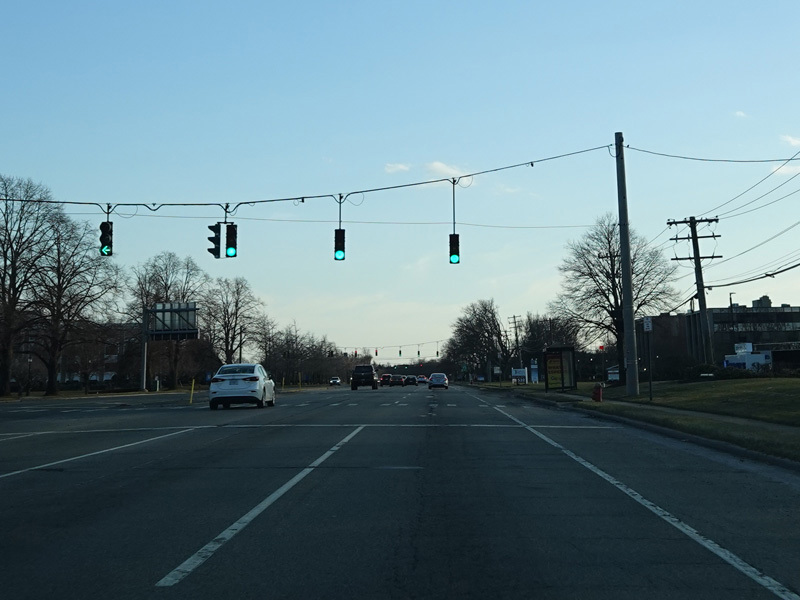 The median ends. Dixon Avenue (CR 2) begins on the left at a traffic light. There is no county route signage at this intersection.