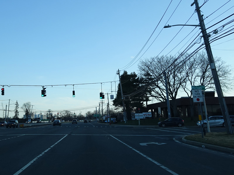 Just south of the split, Walt Whitman Road becomes a divided road. There is a traffic light at Jericho Turnpike (NY 25). Turn left to go east or right to go west.